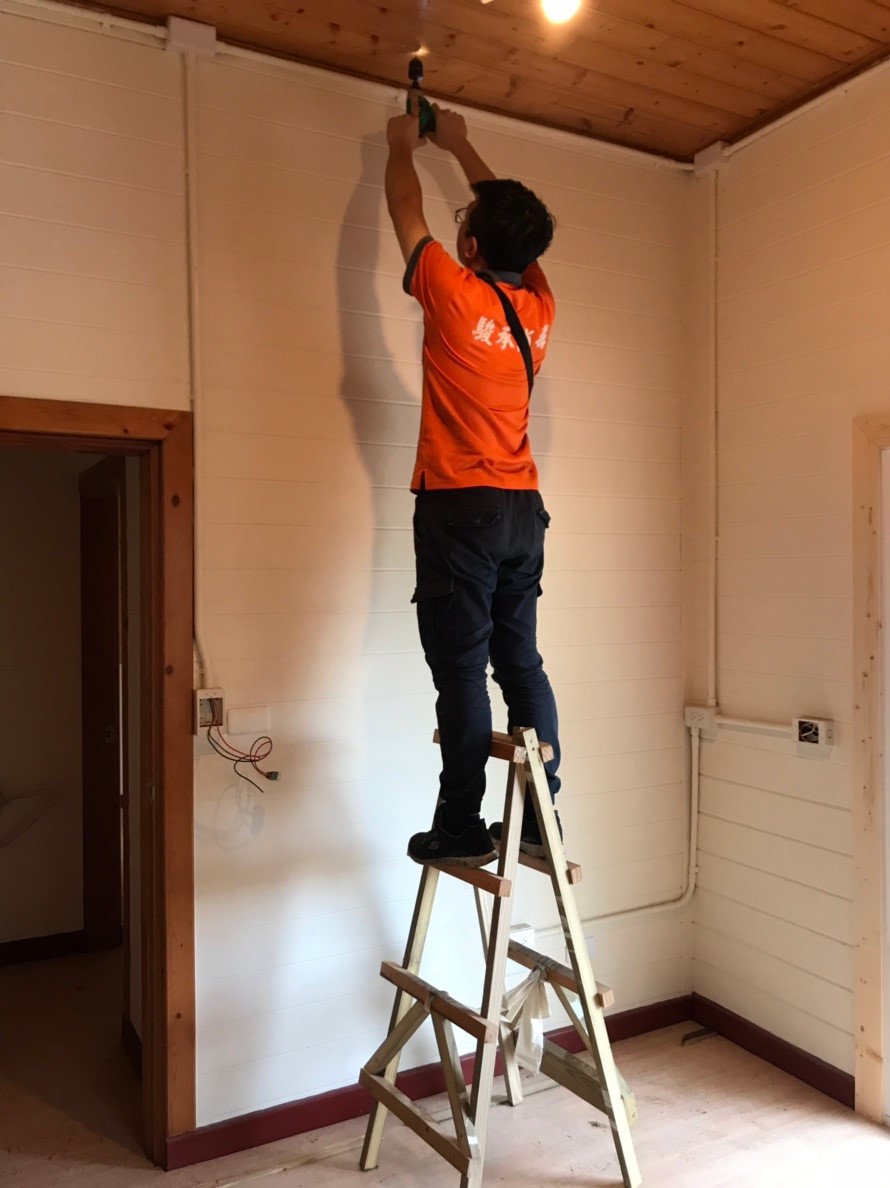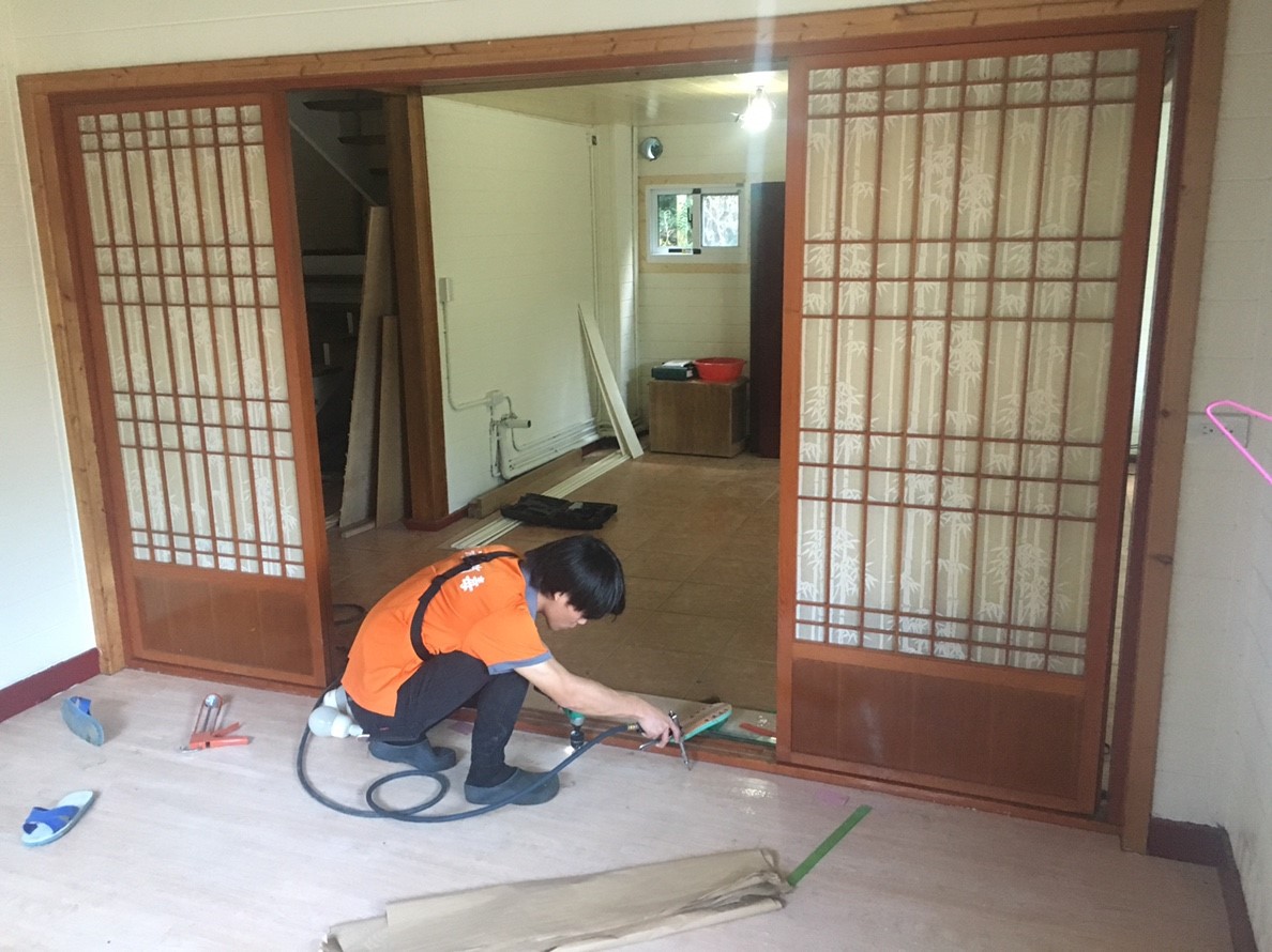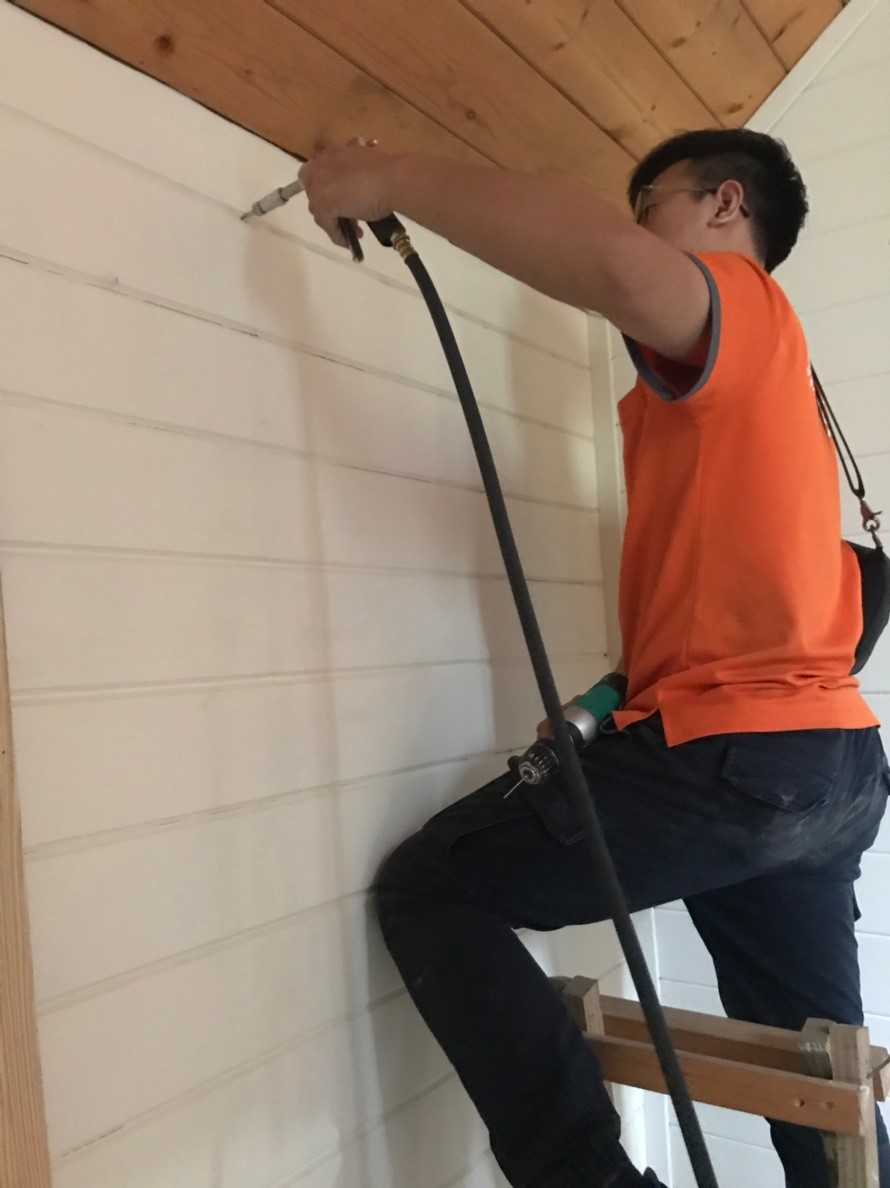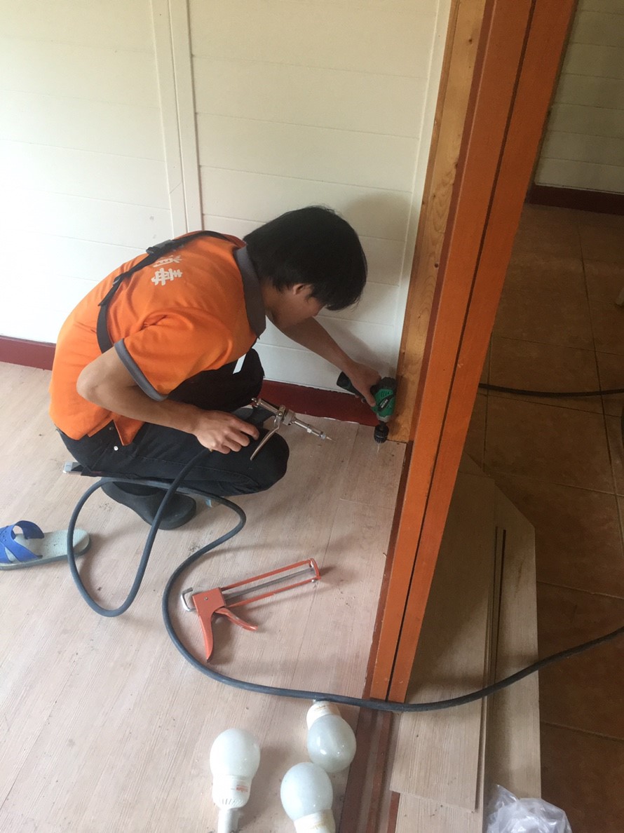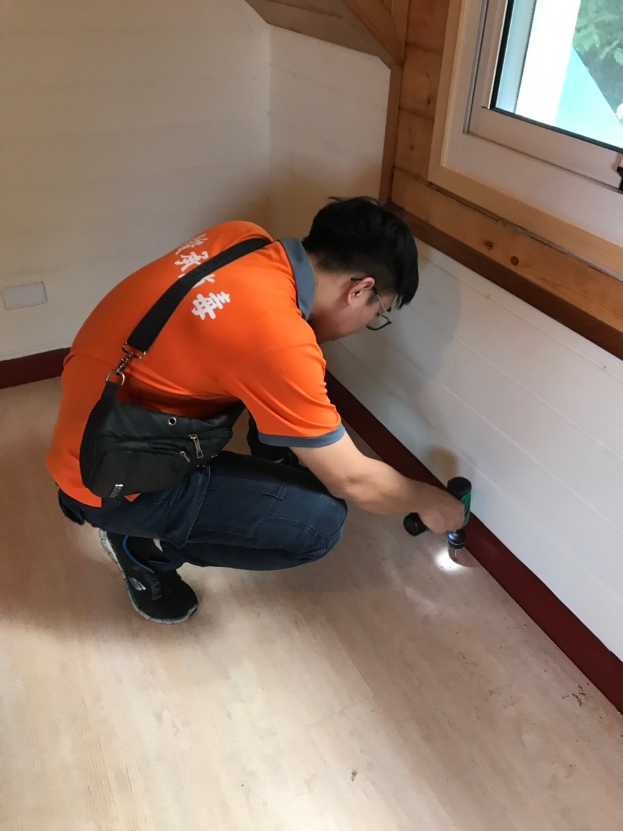(針對裝潢隔間使用2mm鑽頭鑽洞,再打藥在木地板內側,迅速消滅白蟻)