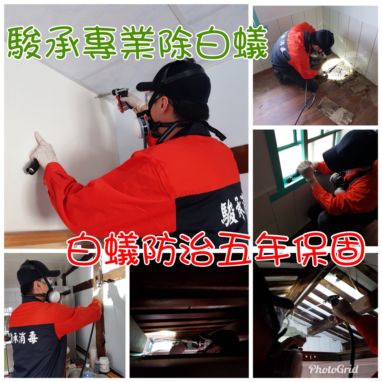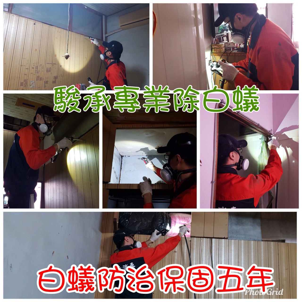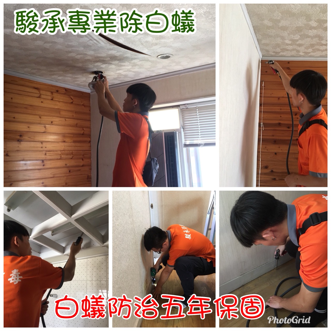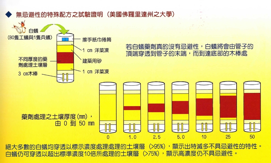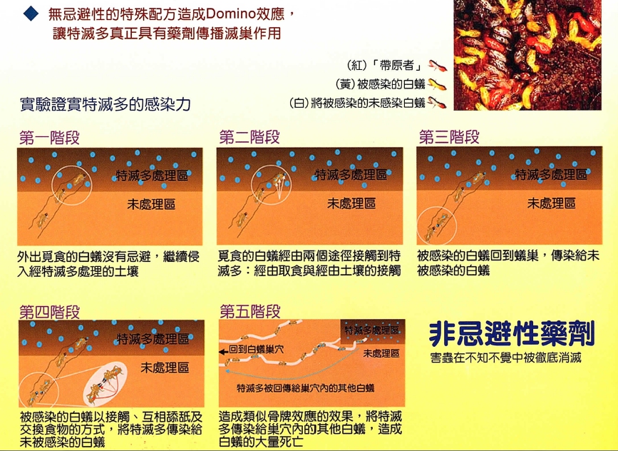 針對住家中的裝潢建材及固定木作,使用2mm鑽孔,平均30~50cm/孔,透過高壓機器設備,灌注在裝潢建材或固定木作與水泥中間的空間,使白蟻經由低濃度芬普尼的木料及裝潢或固定木作,快速感染的大量白蟻。其中可將藥劑透過工蟻回巢時,經由餵食及清潔身體過程中,傳染給白蟻族群的其他成員,造成骨牌效應大量的死亡,除了消滅白蟻之外,還可以保護住家的家具及裝潢建材5年內保固,不再被破壞。