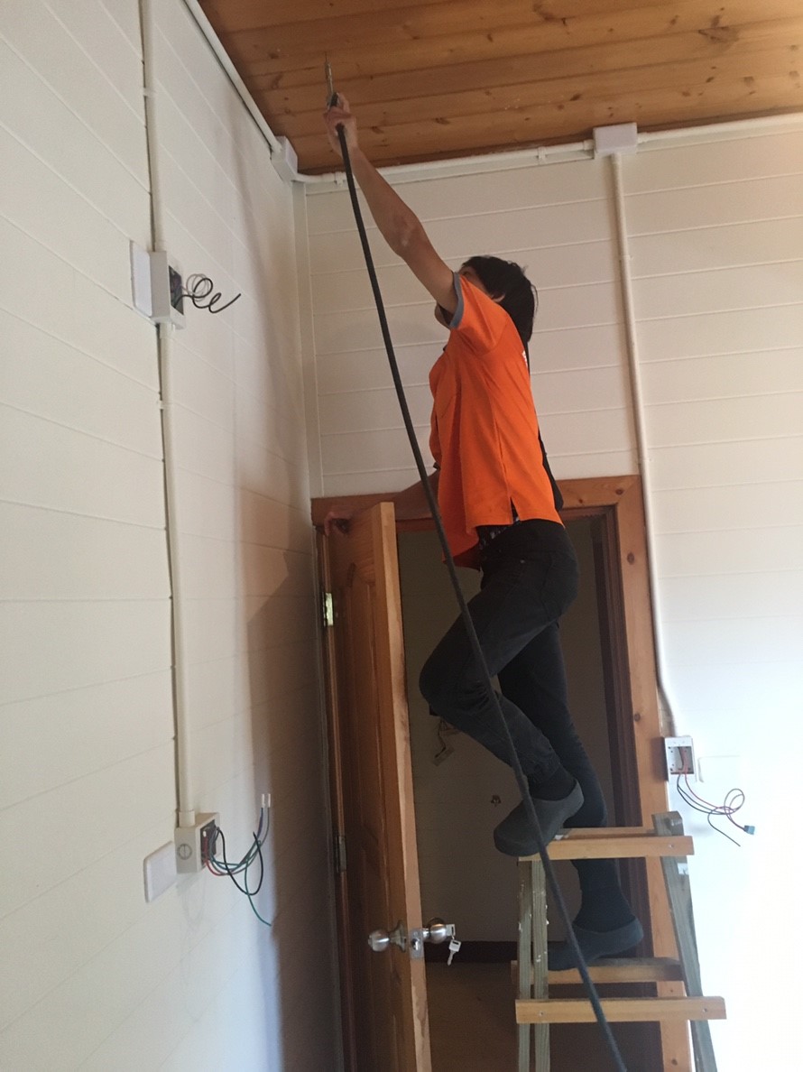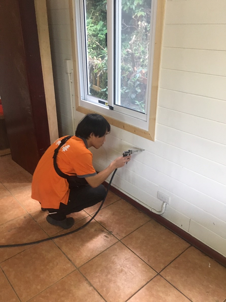 (針對裝潢隔間使用2mm鑽頭鑽洞,再打藥在木地板內側,迅速消滅白蟻)